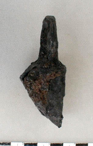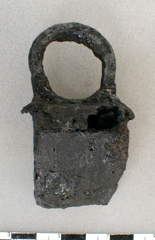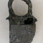 Padlocks, such as the pictured half-heart padlock (see Figures 1 and 2), provided portable security and were in common use during the 1700s. This style was used from around 1730 to 1820. This particular padlock was recovered by archaeologists in a colonial-era trash pit during the winter of 1983 in Gloucester County. It was carefully cleaned, conserved, and repaired by DHR conservation staff in 2003. The lock is currently featured in exhibits and has often been displayed for educational events.