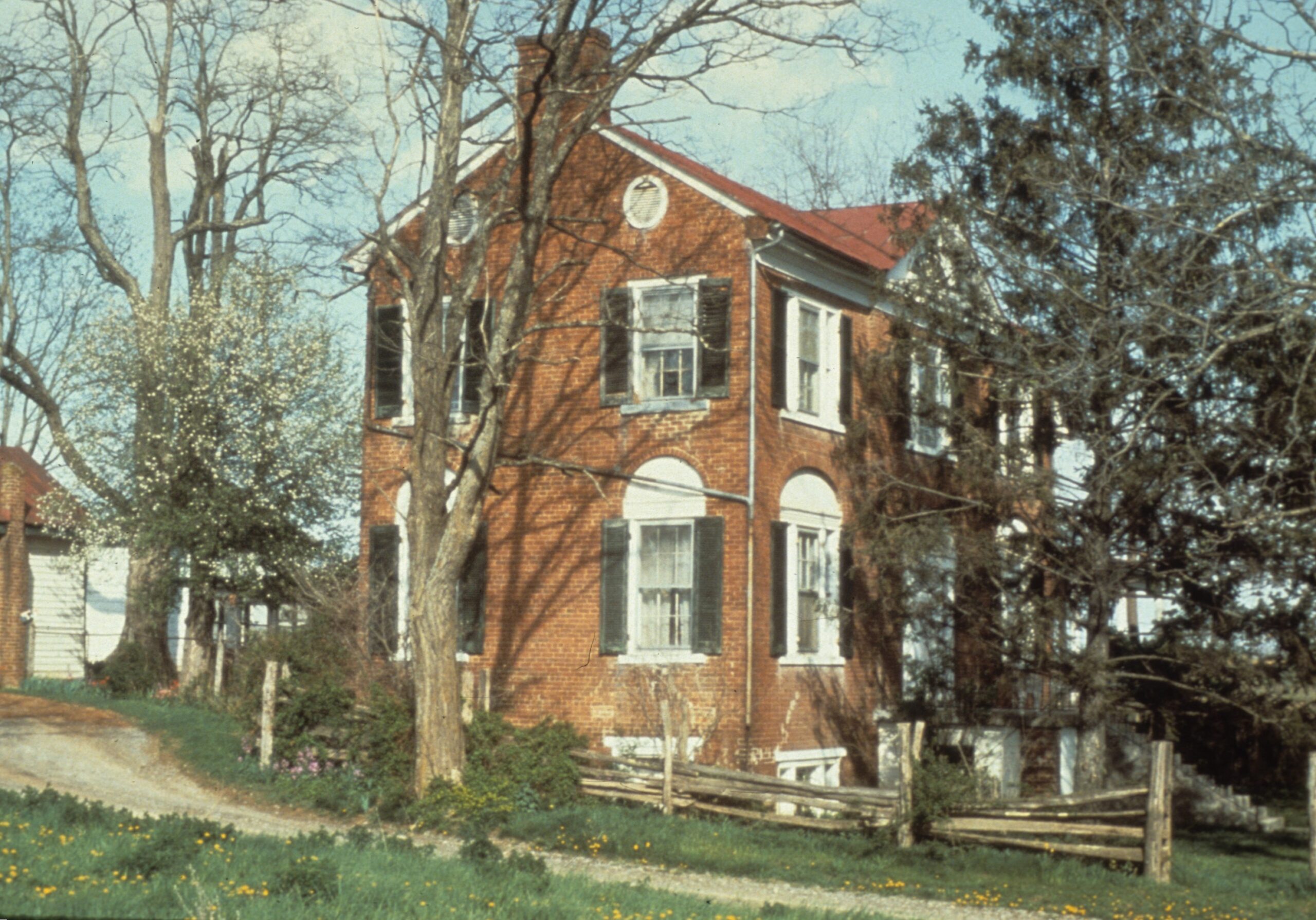 The blending of academic with vernacular architectural traditions lends the Shenandoah Valley farmhouse at Chapel Hill a vibrancy usually lacking in stylistically purer works. Its vernacular I-house form is overlaid with such stylish features as a pedimented entrance pavilion, three-part windows with stuccoed arches, and a fanlight doorway, all boldly and freely interpreted standard Federal forms. Adding interest is the interior woodwork with its exaggerated moldings, much of which preserves early graining and marbleizing. The hall is dominated by a graceful spiral stair. The parlor preserves a rare set of vividly colored French scenic wallpaper with border and wainscot papers. The paper, entitled “Le Petit Decor,” was first published in 1815 and depicts idyllic garden scenes. Several early outbuildings remain in the curtilage. Chapel Hill was completed by 1834 for John Knight Churchman on property in Augusta County that he purchased in 1826, and remains the home of Churchman’s descendants.