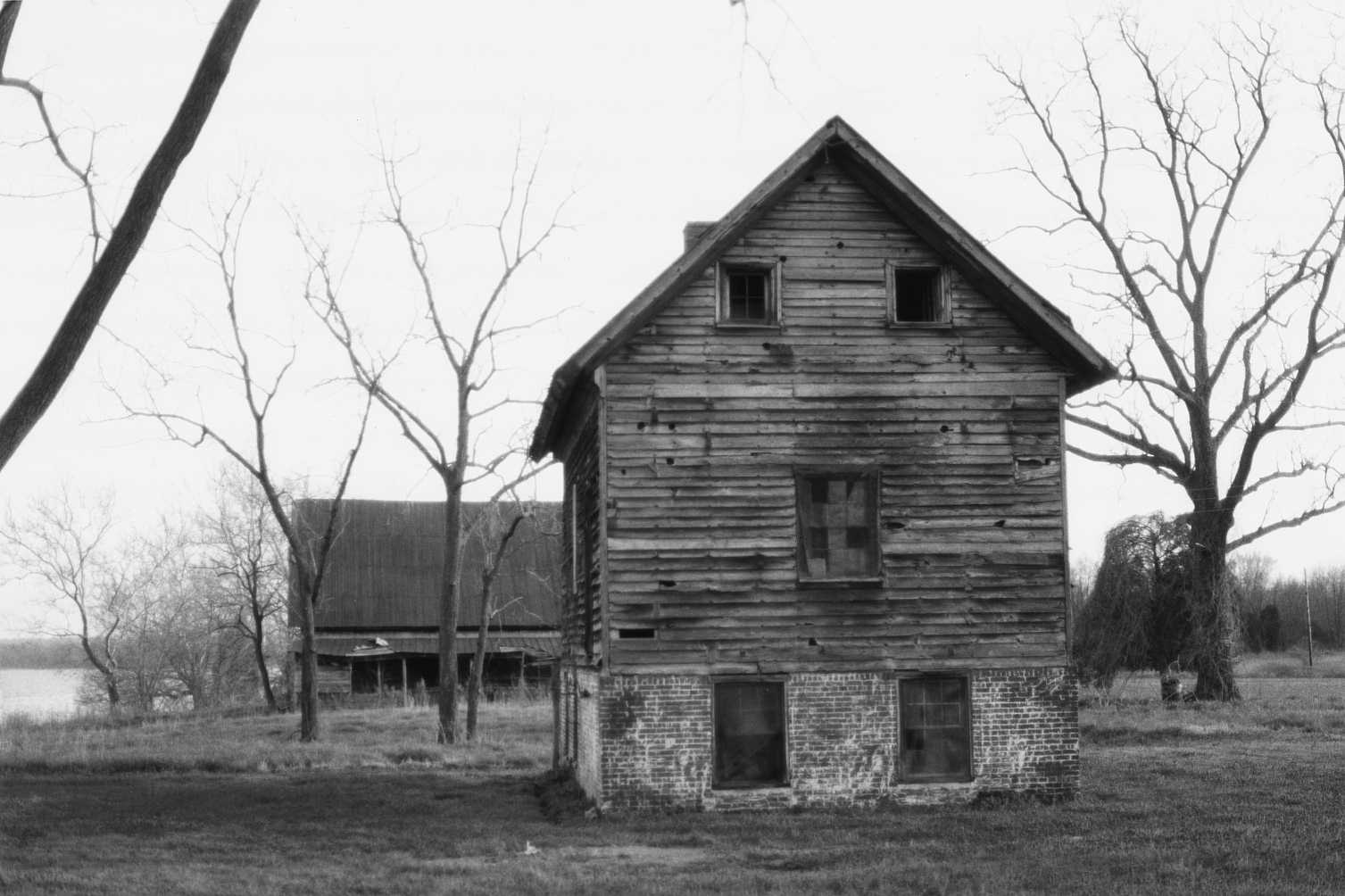 A relic of the days when the Rappahannock River was a main transportation artery for people and commerce, the Port Micou complex, in Essex County’s Occupacia-Rappahannock Rural Historic District, consists of a granary/warehouse and a small dwelling, probably built as an overseer’s house. Named for Paul Micou, a Huguenot, who began purchasing property here in 1697, Port Micou was a wharf complex for much of the 18th century. It was acquired by Robert Paine Waring in 1835 and the two structures were built either by Waring or his son-in-law Richard Baylor, both prosperous landowners. The large two-story granary, notable for its fine workmanship, originally stored wheat that was shipped to Tidewater cities. The functionally related dwelling has but one room and a passage on its main floor. Only with imagination can one picture the hum of activity that once took place at this now quiet and lonely place.