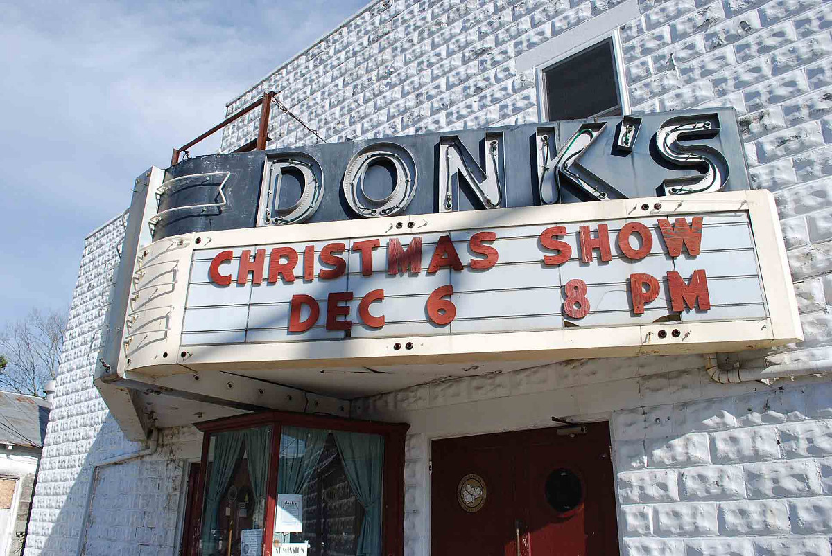 Donk’s Theatre, in Mathews County, built during 1946-47, operated as a motion picture theatre until 1970. It reopened in 1975 as a live country music theater and continues as such today, hosting many well known stars. Built by county entrepreneur W.C. “Donk” Dunton, who established several other neighboring businesses, the theater, with Art Deco touches, exemplifies the kind of simple and inexpensive theater construction found in many rural communities during the post-WWII years when cinema ruled the entertainment world.