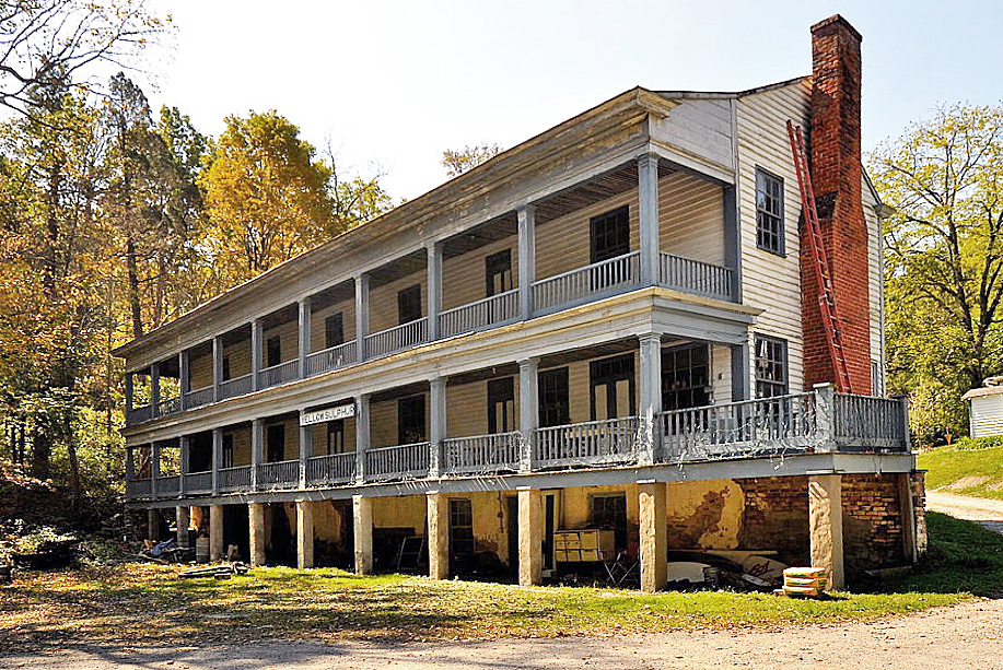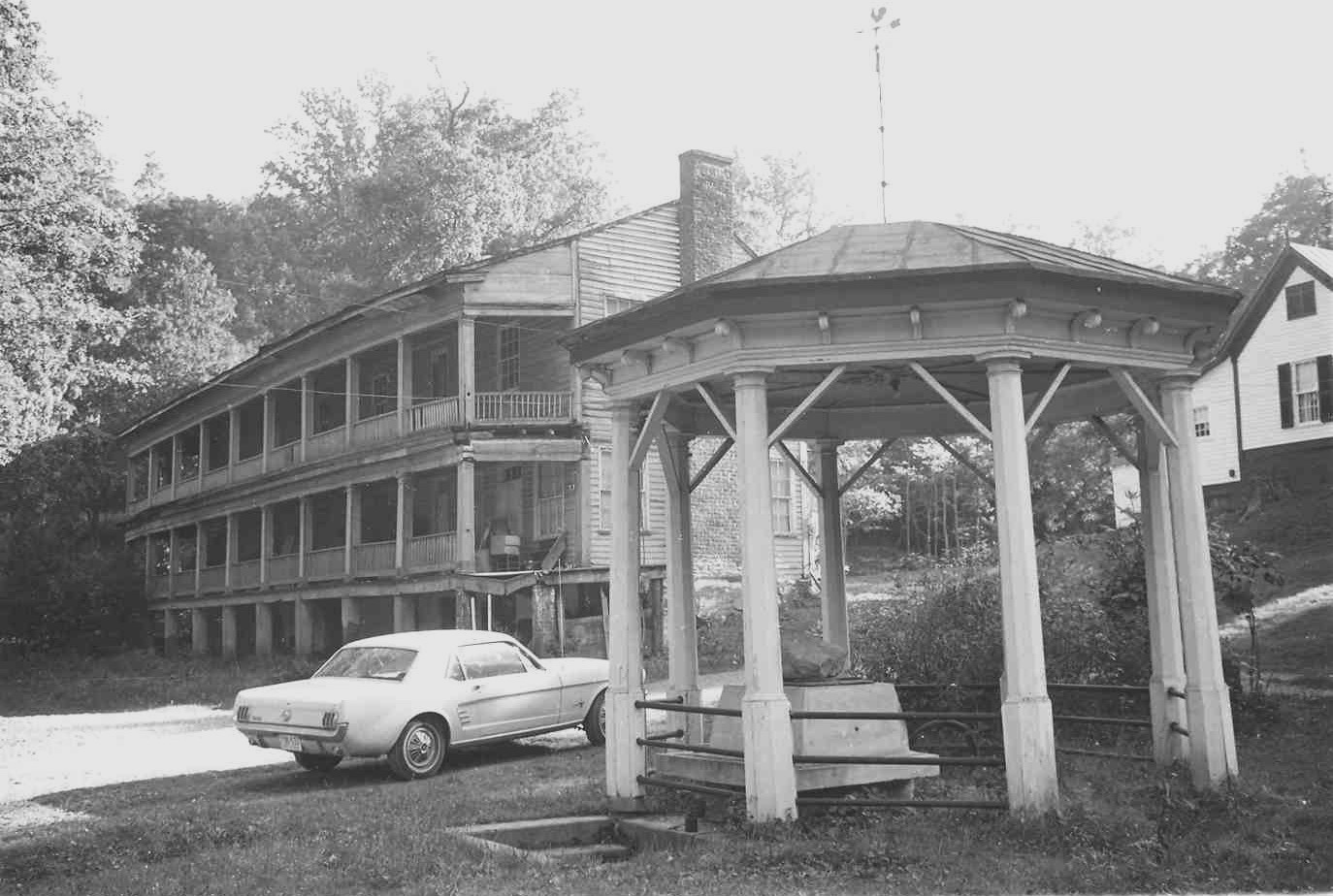 Developed in the early 19th century, Yellow Sulphur Springs in Montgomery County afforded its patrons the usual middle-class leisure-time and therapeutic pursuits of the mid-Victorian-era mountain resorts. Prior to the Civil War, the spa was enjoyed by individuals who soon were to make history: Edmund Ruffin, Jubal Early, and P. G. T. Beauregard. Despite the loss of a later main hotel building and several cottages, the original early-19th-century hotel structure with its mid-19th-century galleried façade survives. Also remaining amid a grove of venerable oaks are three cottage rows and an early bowling alley, making the group one of the state’s most complete early spa complexes. A focal point of Yellow Sulphur Springs is the polygonal gazebo sheltering the spring. Most of the cottages were rented as apartments and the hotel building, long in a neglected state, was restored in the 1990s.