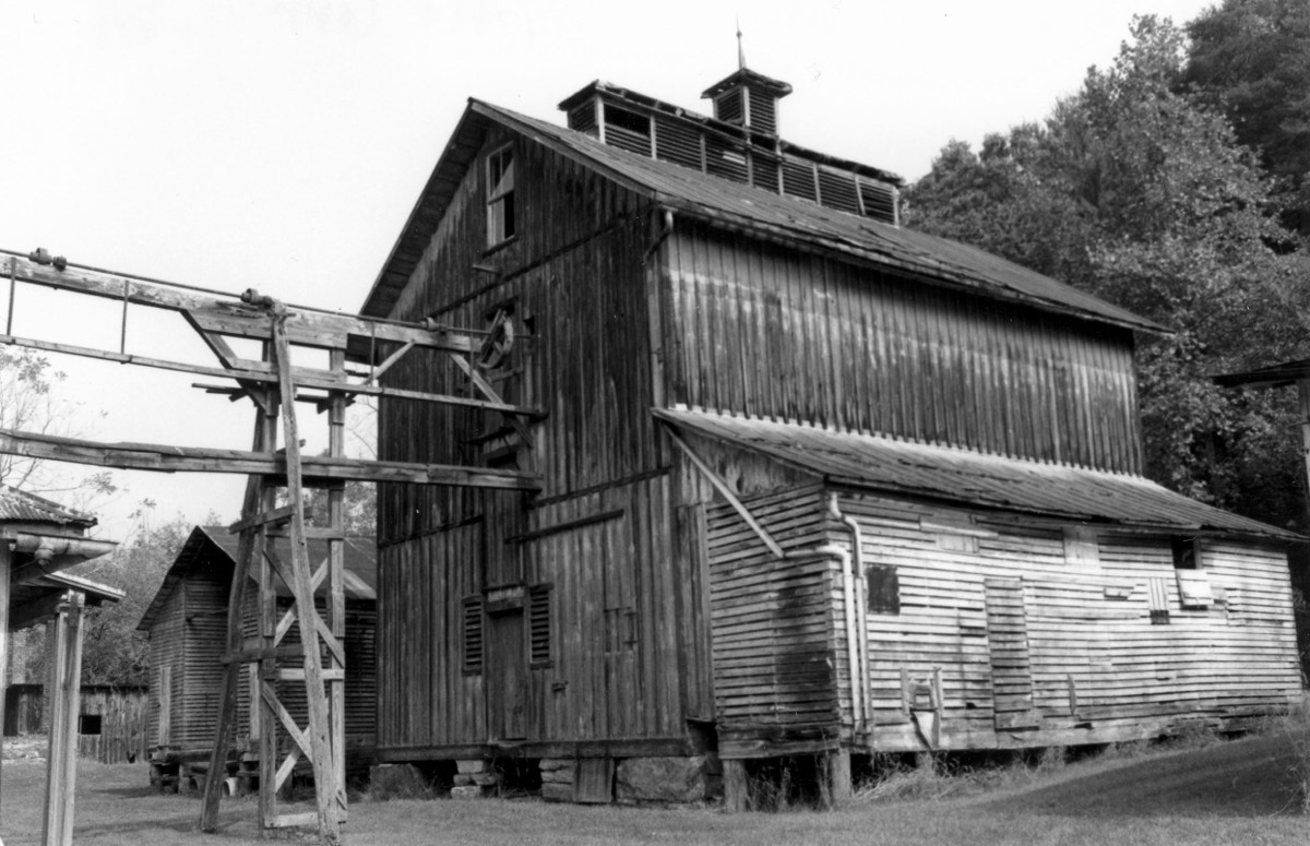 The Grahams Forge Mill is one of the outstanding late-19th-century architectural gems of southwest Virginia. Although utilitarian in function, it is nevertheless a stunning site of rustic beauty: a five-story building on a stone foundation, with a flaking whitewashed, weathered, gray wood exterior; original windows and doors with stylish surrounds and proportionally correct dormers; a paneled frieze below broad eaves; a rusting silver tin roof; and a wonderful little cupola with star motif and decorative cresting. The mill and its complement of outbuildings possess outstanding architectural integrity, and many of the mill’s workings remain in place inside the structures. The current mill, constructed ca. 1890 and operated until 1934, was the third one to occupy the site. Its predecessors were the former Graham’s Forge that featured a furnace, iron rolling mill, and nail factory, and the earlier Crockett Forge, which was established in 1796. The site is named for David Graham, who acquired the forge in 1826 and later left it to his son, Major David P. Graham.