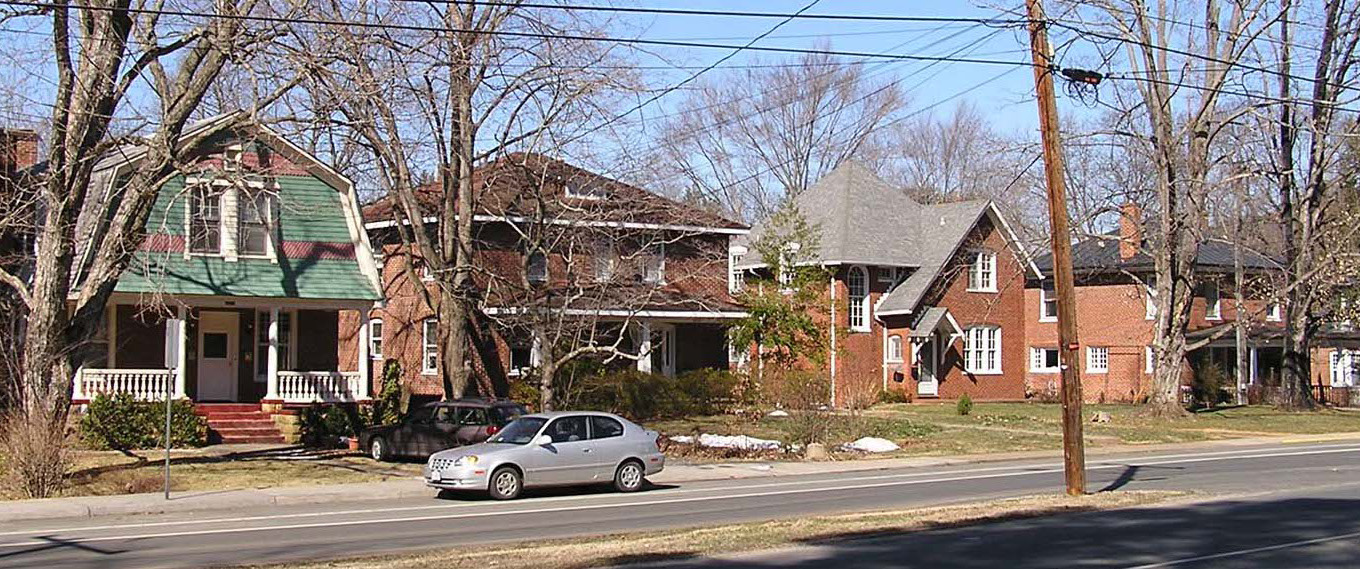Situated in the southwest portion of Charlottesville, the Fry’s Spring Historic District derives its name from the 18th- and 19th-century Fry family, landowners in the area and proprietors of the two abundant natural springs that carry the Fry family name. With its convenient access to the city’s center, the district emerged initially as a recreational, then later, a residential area. S. Price Maury purchased 170 acres of land in 1890 surrounding Fry’s Spring and created the Jefferson Park (later Fry’s Springs) Hotel and Land Improvement Company centered on the open space of Jefferson Park. In 1913 the hotel was demolished and during the 20th century the Fry’s Spring district’s rolling topography, winding streets, generous tree cover, and particularly its distinctive Jefferson Park Avenue corridor served by trolleys and electric streetcars, made the area a notable landmark neighborhood for residents of Charlottesville. In 1920, the Jefferson Park property was purchased and developed as the Fry’s Spring Clubhouse, which boasted an enormous swimming pool and affiliated recreational structures in a park-like setting, making it a focus of the emerging neighborhood.