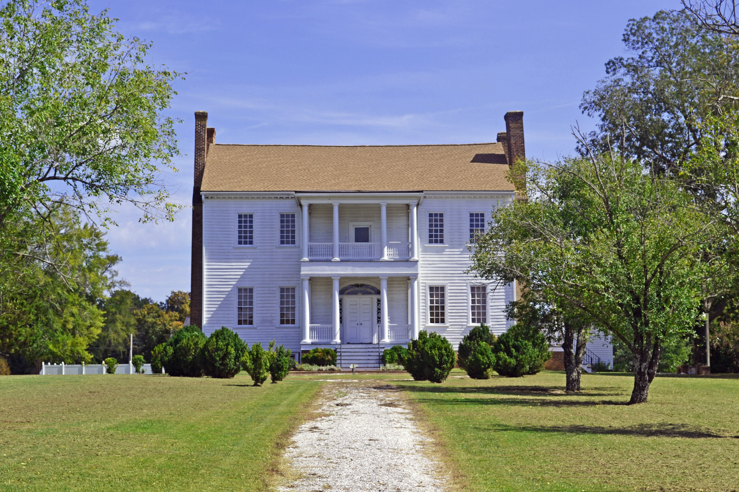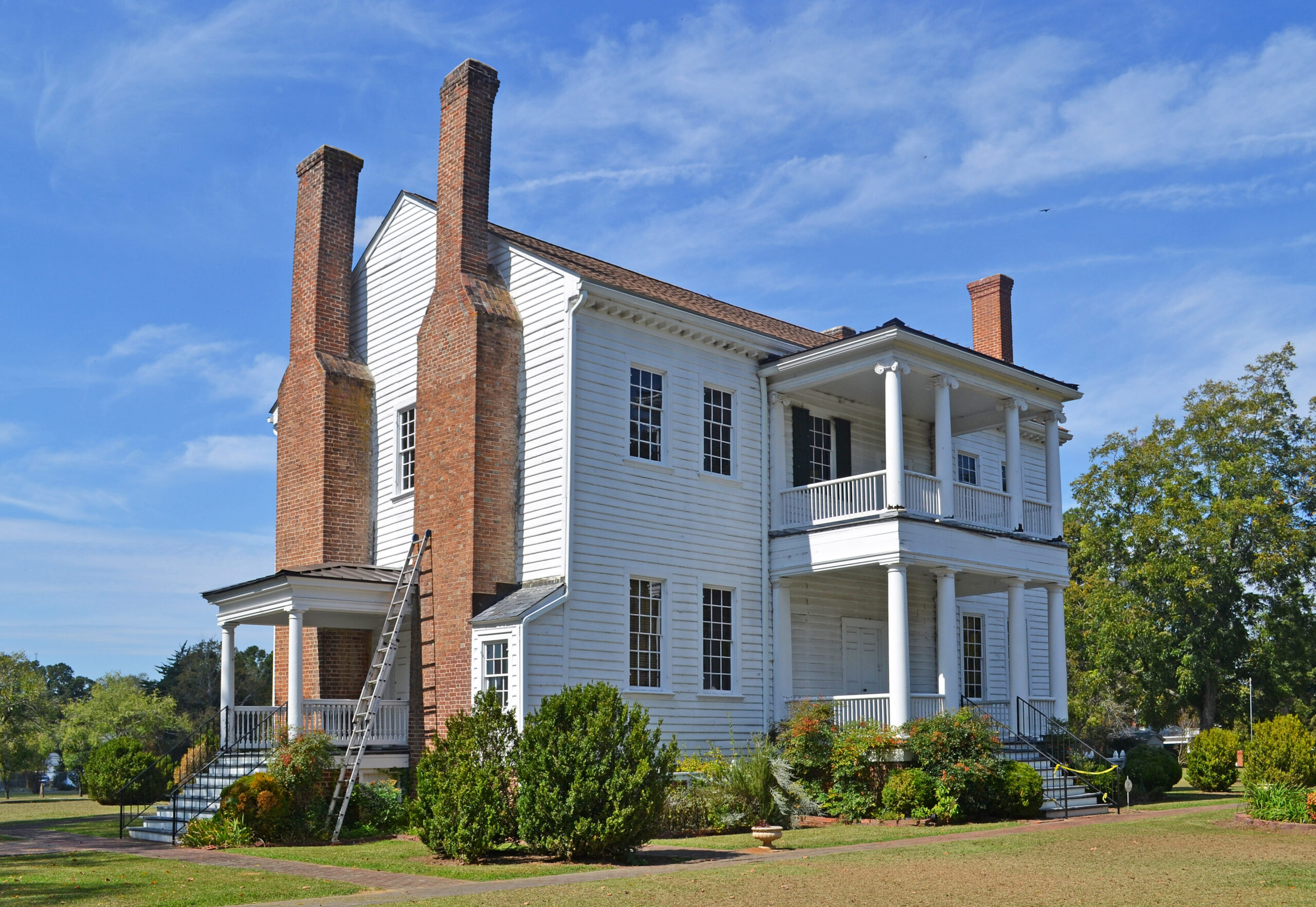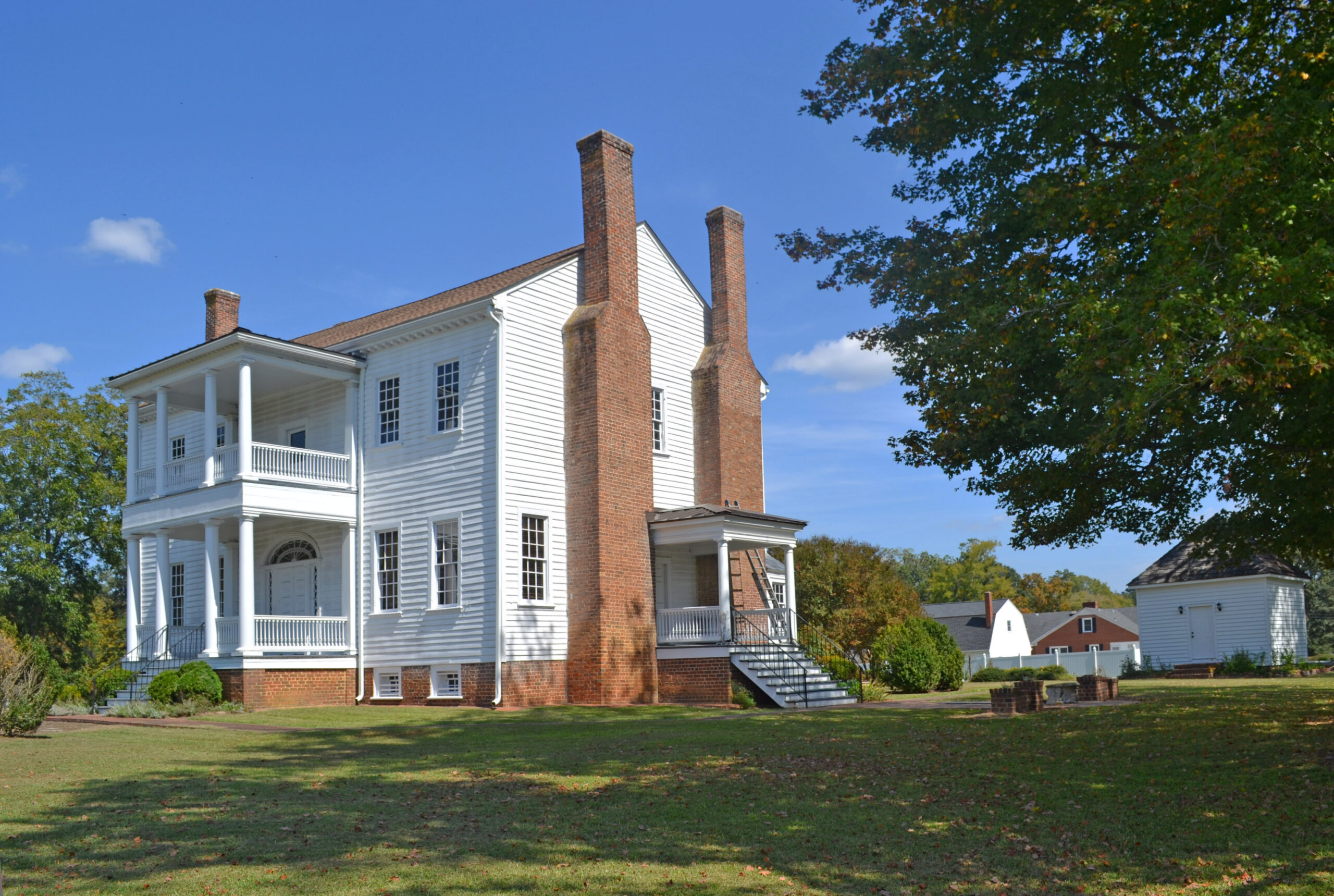 Surrounded by spacious, park-like grounds, Village View is the city of Emporia’s outstanding example of Federal architecture. The imposing house features a refined main stair, richly ornamented mantels, and unusual scrollwork decoration in the main entry fanlight and sidelights. Village View was built in the 1790s for James Wall, member of a prominent local family. It was purchased in the 1820s from Wall’s heirs by Nathaniel Land who made improvements to the house prior to his marriage to Maria Pendleton Woodlief in 1830. The house served as a Confederate headquarters during the Civil War; generals W. H. F. Lee, Wade Hampton, and Matthew Butler met in the parlor. After the war William Henry Briggs operated a boys’ academy on the property. In 1986 Village View was donated by the Briggs family to the Village View Foundation, which has since restored the house for public exhibition and use.